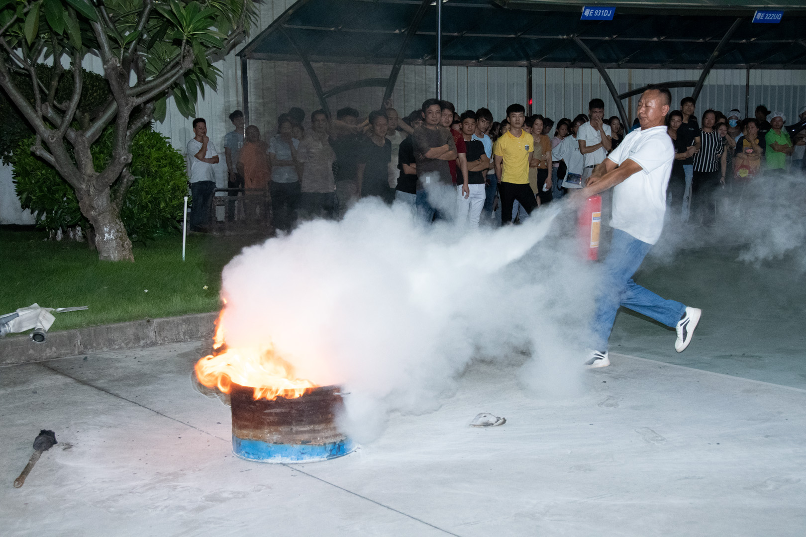 ▲實操演練、員工進行實踐演習;使用滅火器、水帶等等